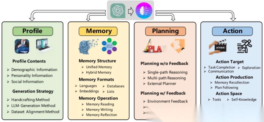 在该架构中,配置文件模块用于确定智能体的角色,记忆模块和规划模块将智能体置于动态环境中,使其能够回忆过去的行为并规划未来的行动,行动模块负责将智能体的决策转化为具体输出。在这些模块中,配置文件模块影响记忆模块和规划模块,而这三个模块共同影响行动模块。