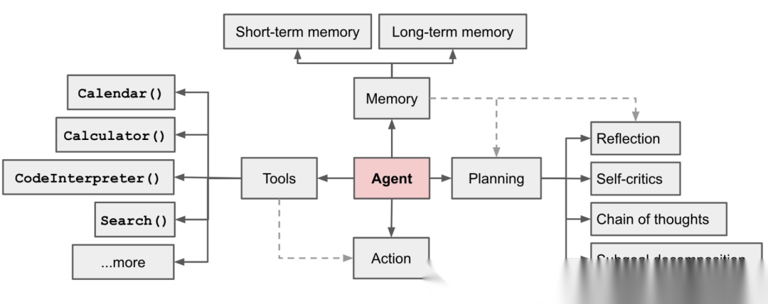 在这个架构中,Lilian Weng提出了 Agent=LLM + 规划 + 记忆 + 行动(工具使用)的基础架构。其中 LLM 扮演了 Agent 的 “大脑”,强调LLM作为系统的核心控制器,提供推理、规划、决策的能力;记忆组件提供记忆能力,使其能够存储和检索外部的相关信息,来优化决策;行动组件执行决策产生的行动,也可利用工具与外部环境进行交互; 而 Agent位于中心位置,它通过协同各种组件来处理复杂的流程,最终自主完成目标任务。