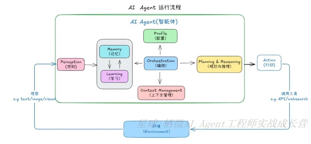 - 循环与终止:编排模块评估任务完成情况,若未达成目标则启动下一轮“感知->记忆->上下文->决策->行动->学习”循环;若达成目标或触发终止条件(如最大迭代次数),则停止运行并输出最终结果。