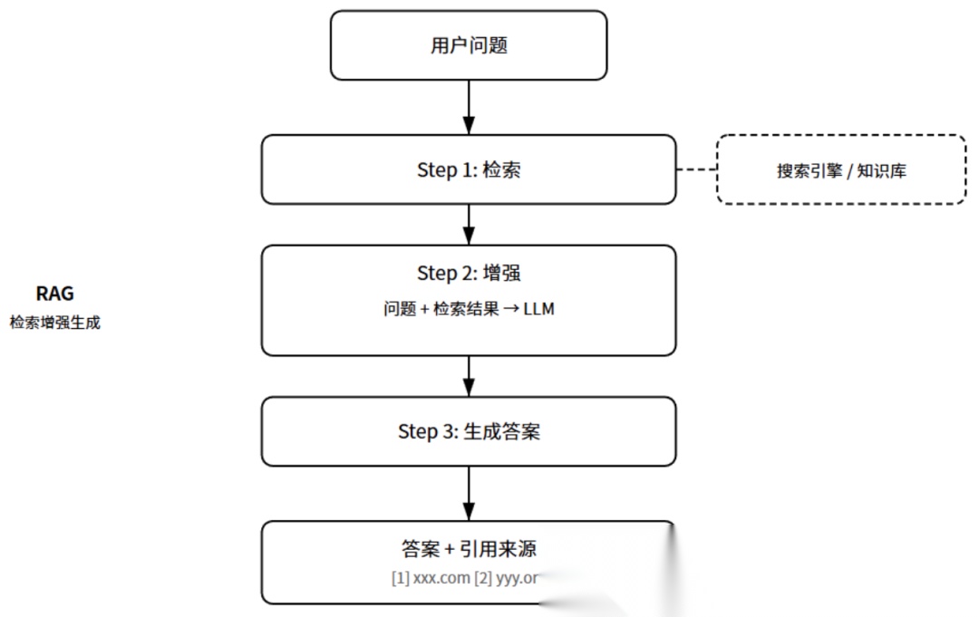 AI搜索通常采用RAG架构,全称是检索增强生成。工作流程分三步:第一步,把用户问题发给搜索引擎,获取相关网页内容;第二步,把检索结果和用户问题一起发给大模型;第三步,大模型基于检索到的内容生成答案。这样既保证了答案的时效性,又能引用真实来源,大大降低幻觉问题。