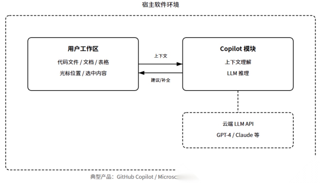 典型产品:GitHub Copilot做代码补全、Microsoft 365 Copilot做文档和PPT、Notion AI做笔记和知识管理、Cursor做编程辅助。