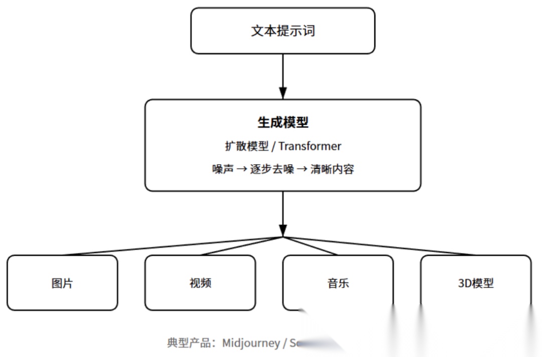 典型产品:Midjourney做图像生成、Sora做视频生成、Suno做音乐生成、Runway做视频编辑。