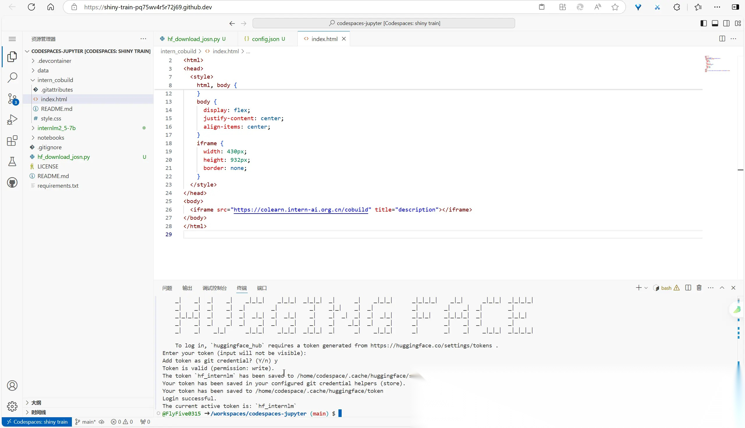 - 然后将“任务一”中的config.json复制到CodeSpace的intern_study_L0_4文件夹中