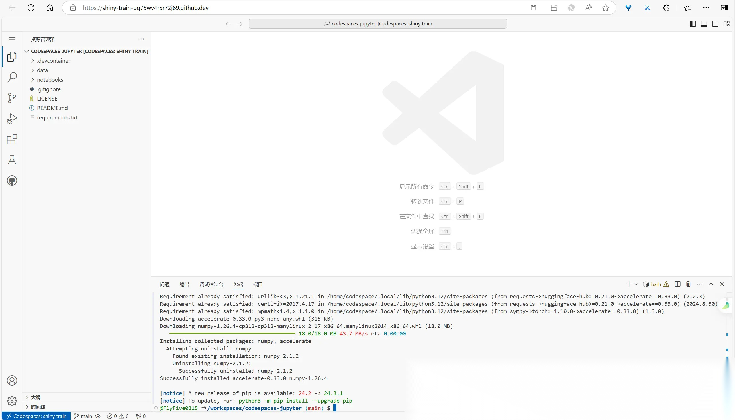 - 打开 GitHub CodeSpace , 创建Jupyter Notebook环境,类似网页版VSCode。