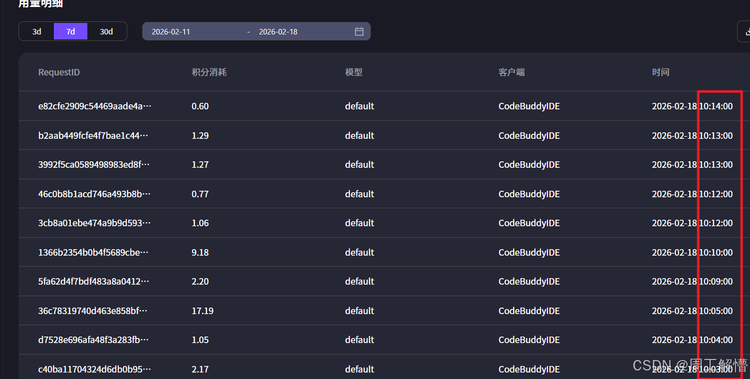 从截图中可以看到,在 2026-02-18 10:03 到 10:14 这 10 分钟内,你的积分消耗明细如下:0.60 + 1.29 + 1.27 + 0.77 + 1.06 + 9.18 + 2.20 + 17.19 + 1.05 + 2.17 = 36.78 积分