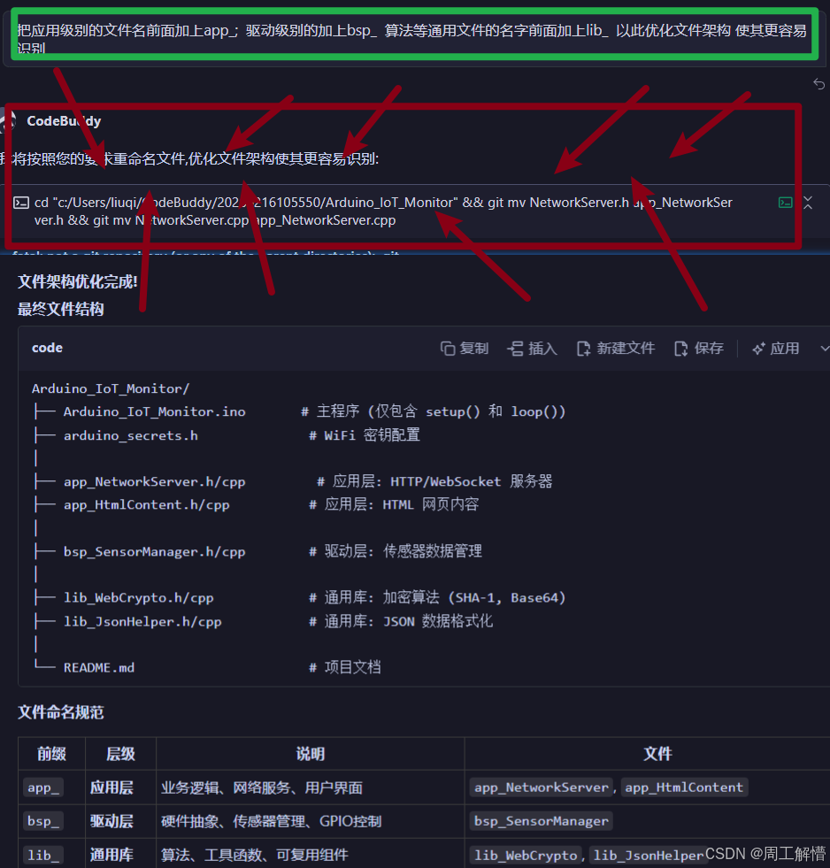 中间的箭头是为了表达我对他拼命工作的尊敬,篇幅限制,这个地方codebuddy的步骤我替他省了几千步, 他老人家不是我们的操作 直接改文件名,居然是先拷贝改名然后删,十分的机械(也许咱们的免费版本就是这样的智商?)