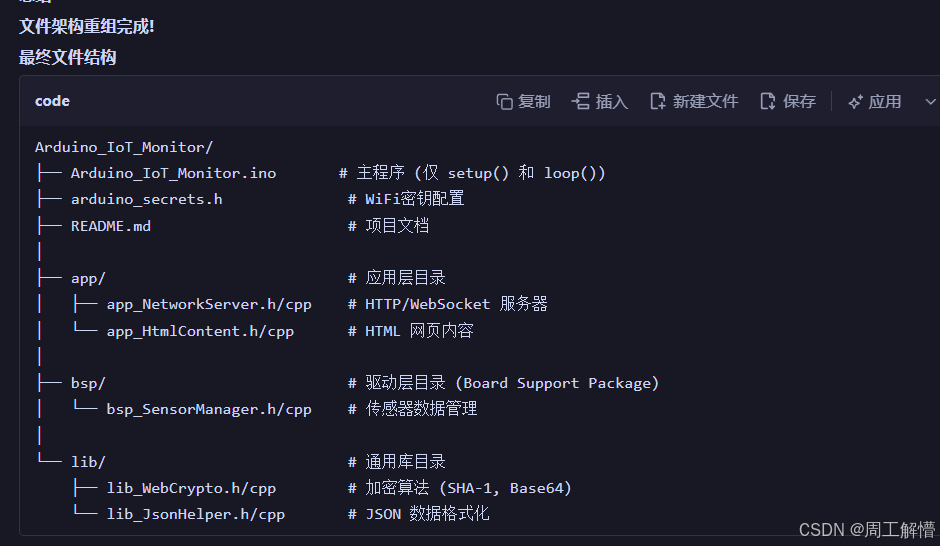 本文记录了使用CodeBuddy辅助开发Arduino物联网监控系统的过程。作者通过分层架构设计(应用层、驱动层、通用库)构建了一个模块化系统,但遇到头文件嵌套导致的编译错误。CodeBuddy在迭代过程中表现出机械化的处理方式,平均每次修改需调整2次错误。最终项目耗时10分钟消耗36.78积分(约4.2元),换算每小时成本约25元。作者反思了AI工具的局限性,特别是对C语言编译规则的理解不足,同