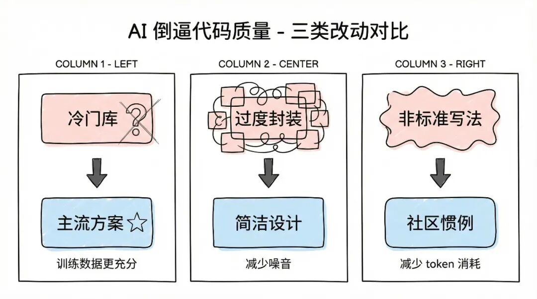 一个有趣的逆向变化也在这个阶段出现:为了让 AI 工作得更好,主动改进了代码本身。具体包括三类改动。第一,把冷门的第三方库替换成社区主流方案——AI 对热门库的训练数据更充分,表现更好,而社区惯例本身通常也更合理。第二,删除过度封装和不必要的抽象层——那些"只有原作者能看懂"的设计模式,对 AI 来说是纯粹的噪音。第三,将非标准写法改为社区惯例——冗余的自定义实现换成标准库提供的方案,减少了因为奇怪规则而额外消耗的 token。