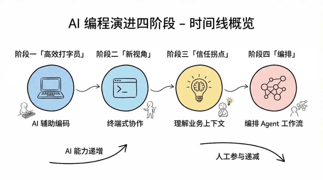 本文记录了一位九年工程师使用AI编程工具的演进过程,分为四个阶段:AI作为高效打字员、新视角交互范式、AI理解业务上下文的信任拐点、以及从编程到编排的转移。文章指出,随着AI能力的提升,工程师的核心竞争力将从写代码的速度转向编排AI工作流的能力,并强调AI友好将成为未来编程的重要标准。
