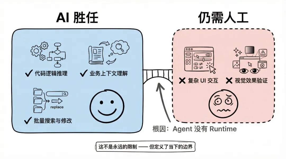 根本原因是 agent 没有 runtime。它能推理代码逻辑,但无法"看到"界面的实际渲染效果。虽然 agent browser 和 Chrome DevTools MCP 等方案已经出现,但目前的连接成本和响应速度都还不够实用。这意味着但凡涉及复杂视觉交互的场景,人工调试和验证仍然是不可替代的。