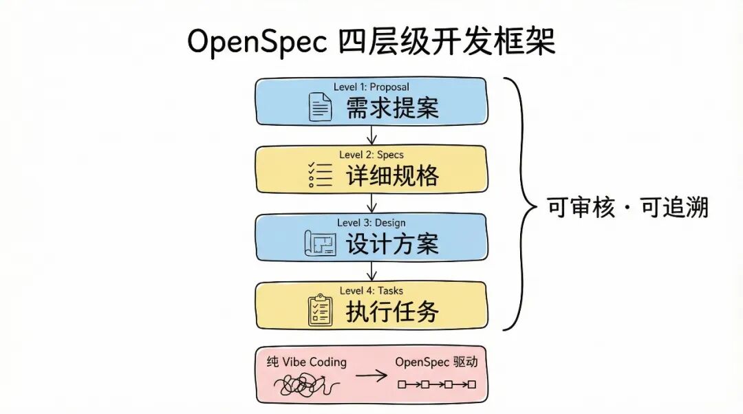 这个阶段引入了 OpenSpec——一个 spec 驱动的开发框架。纯 Vibe Coding 的问题在于过程不可控:agent 在多轮对话后容易遗忘之前的任务上下文,而且无法追溯它为什么做出某个决定。OpenSpec 通过将需求结构化为 proposal、specs、design 和 tasks 四个层级,让整个开发过程变得可审核、可追溯。它解决的核心问题不是"AI 能不能写代码",而是"AI 写的代码是不是按照约定来的"。