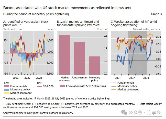论文中的图如下所示,作者使用原始的报纸数据,分析出来的结果如论文 Graph 3 所示。作者发现,三类情绪赋分求和后,情绪积极性与股市的表现总体是吻合的,也就是说,基于大语言模型对新闻进行情感分析的方法准确性较高。考察三类情绪得分的相对重要性时发现,市场情绪、基本面与股票回报率的联动性最强,相关系数分别达到 0.64 和 0.52。货币政策情绪与股市表现的相关性较弱,仅为 0.30,作者认为可能与不同政策间相互作用有关。