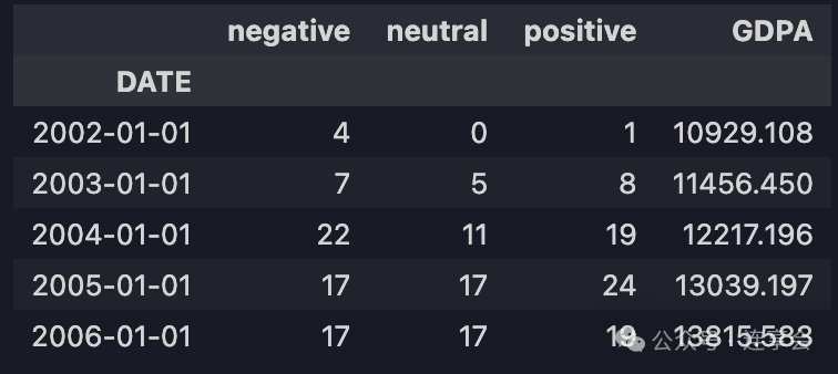 # 在这里,会得到一个包括日期、负面情绪词数、中性情绪词数、积极情绪词数和美国GDP四列的表格,如下图所示。