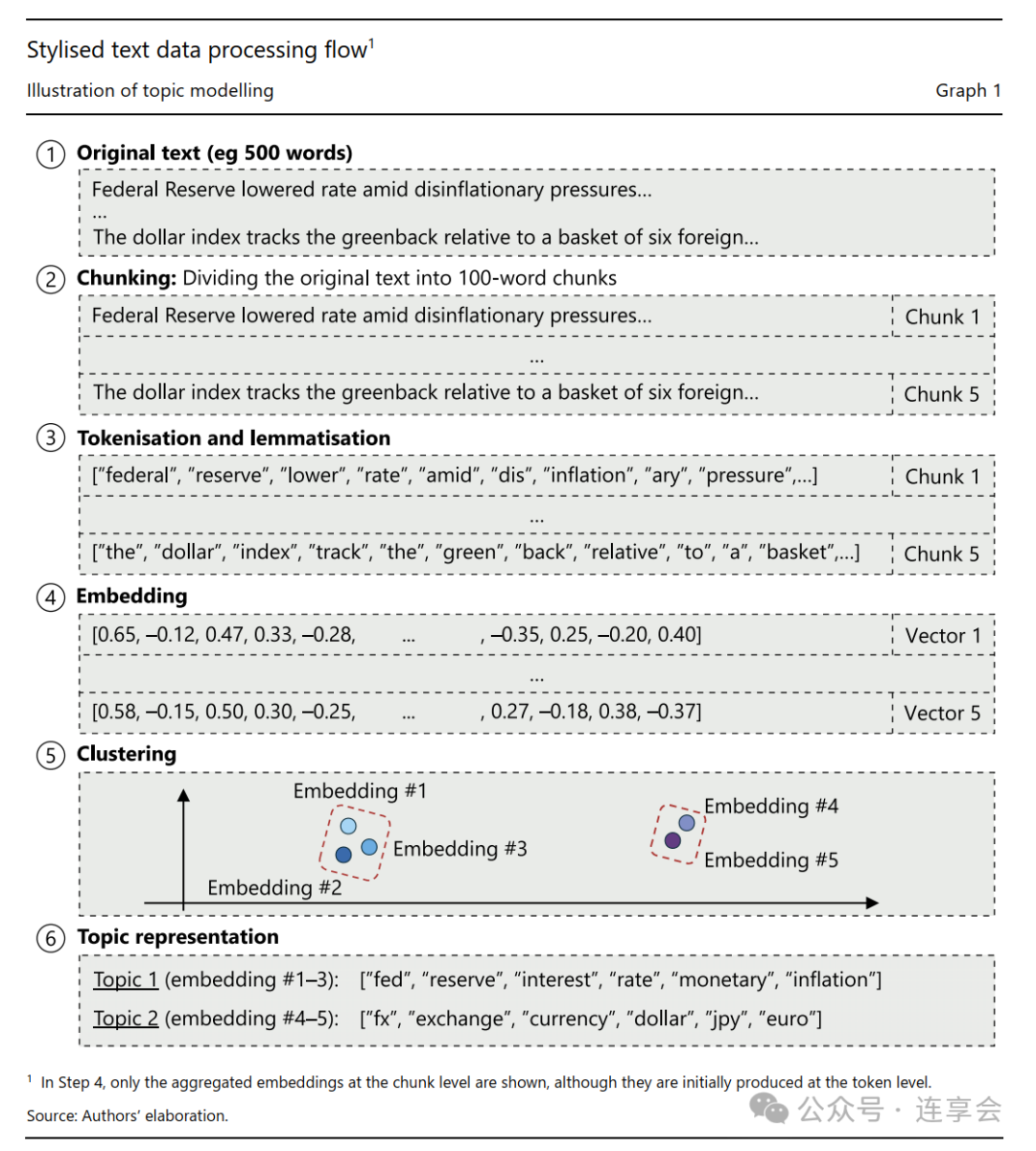 有监督学习可以避免产生这一问题,有监督学习允许研究者从外部选择一些自己感兴趣的主题。 一个常见的选项是 seeding,可以输入一系列与研究者研究兴趣有关的词语,引导主题词建模的过程。例如,研究者可以将 " 联邦储备委员会 “、” 政策利率 " 关键词输入给有监督学习模型,这种情况下,主题词聚类时就会更偏向宏观金融相关的主题。数据处理、Tokenizastion、数据嵌入化和主题词分类等主要步骤的流程如 Graph 1 所示。