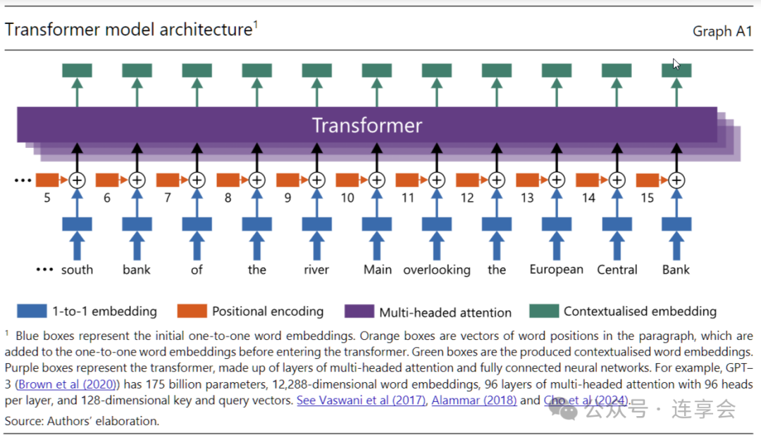 让大语言模型成为自然语言处理技术最前沿的功能,就是它的 “transformer architecture”。 Transformer 可以准确识别不同词语在不同语境里的不同含义,不只是字典中的意思。例如,在上述的例子中,大语言模型可以准确地将 “bank” 识别为靠近 “money” 的词意,因为 “bank” 经常和 “money”、“rate” 出现在同个文本中,因此不会识别为 “河岸” 的意思。并且,大语言模型也会考虑词语在句子中的顺序,从而明确区分出 “The bank raises rates to lower inflation” 和 “The bank lowers rates to raise inflation.” 两句话的不同含义。