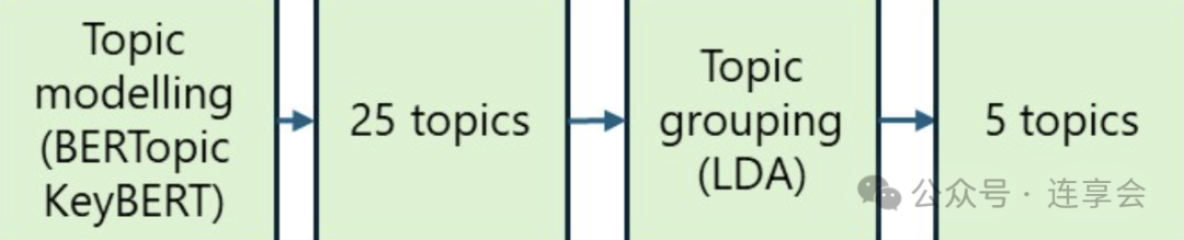 研究者需要通过降维的方法。从文本中提取出信号和关键信息。 它通过提取对语义解释的最关键信息,降低高维的嵌入向量,提高计算性能。在大语言模型的分析中,能够完成这一方法的工具包括主题词建模 (topic modelling) 、聚类方法 (clustering techniques) 或者类似于 UMAP (Uniform Manifold Approximation and Projection) 的基于嵌入法的降维方法。本文主要关注 topic modelling 这一方法,因为它被较为广泛地应用。主题词建模可以是无监督的,也可以是有监督的。