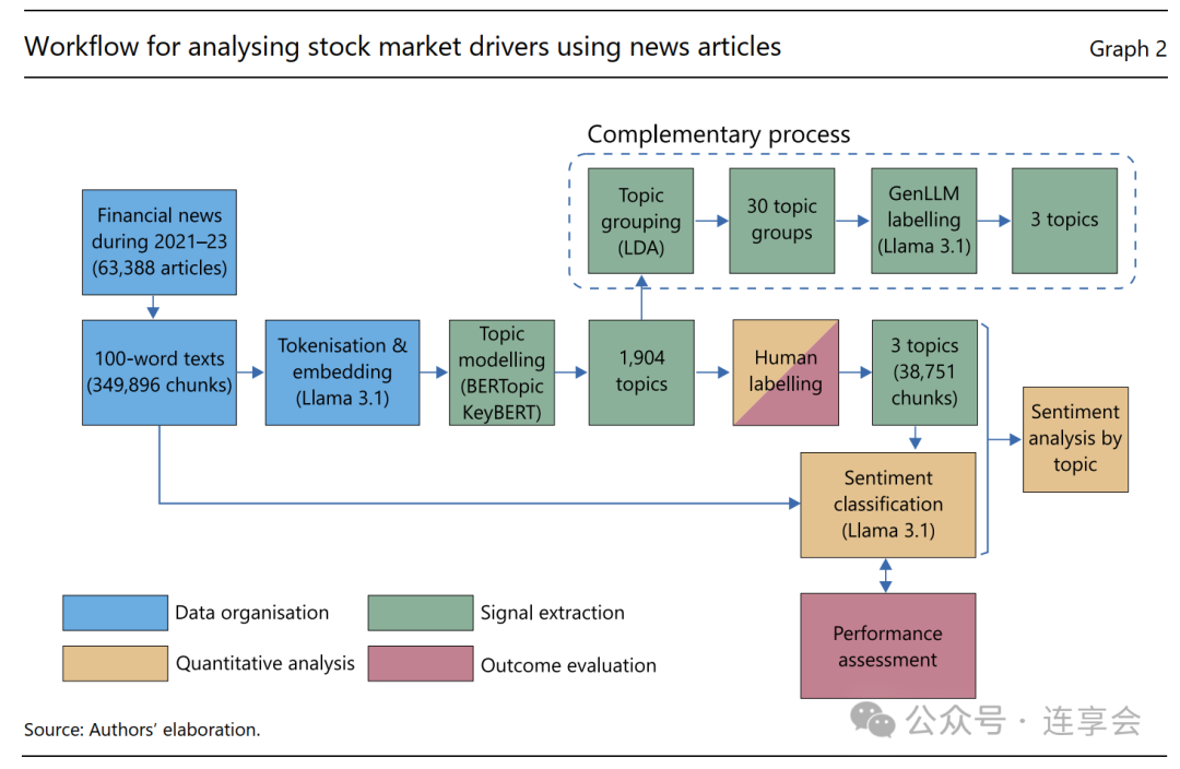 本研究的目标是使用美国新闻报道的文本,识别美国股票价格的影响因素。本研究包括了 2021 年至 2023 年 63388 份日报新闻,覆盖了福布斯、路透社和 MarketWatch 等网站。样本期覆盖了美国的货币政策急剧收紧的时期和通货膨胀率较高的时期,作者操作的流程如下所示,主要包括了数据处理、主题词分类、情感分类和量化分析四大步骤