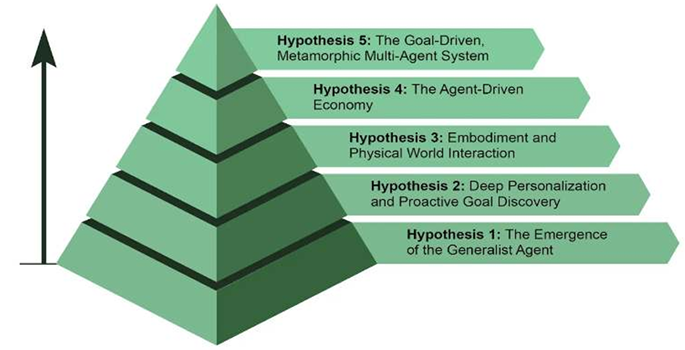- 假设五:目标驱动、变形多智能体系统。智能系统将不再依赖显式编程,而是根据用户声明的目标自主实现。用户只需提出期望结果,系统就能自动规划并达成。