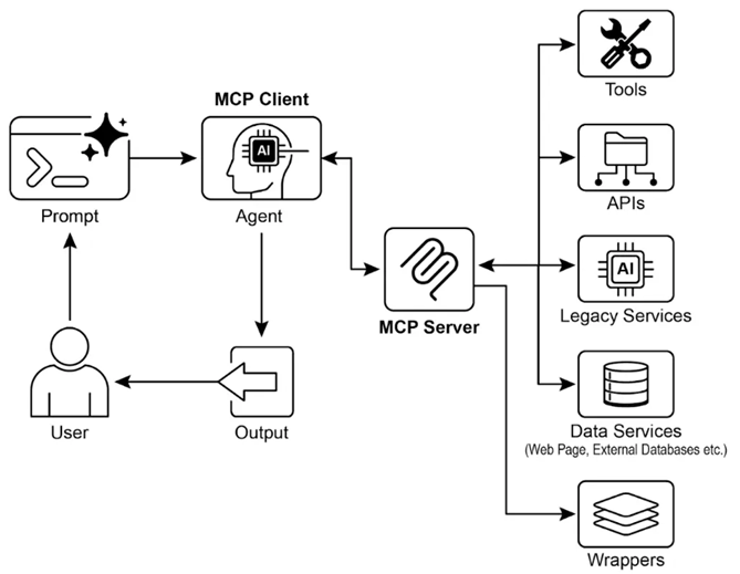智能体需要能够与外部环境交互,包括访问实时数据、调用外部软件、执行具体操作任务。模型上下文协议(MCP,Anthropic公司于2024年11月提出)正是为此而设计,它为LLM与外部资源的对接提供了标准化接口,是实现一致性和可预测集成的关键机制。可以将MCP想象成一个通用适配器,让任何LLM都能无缝连接到任何外部系统、数据库或工具,无需为每种组合单独开发集成。