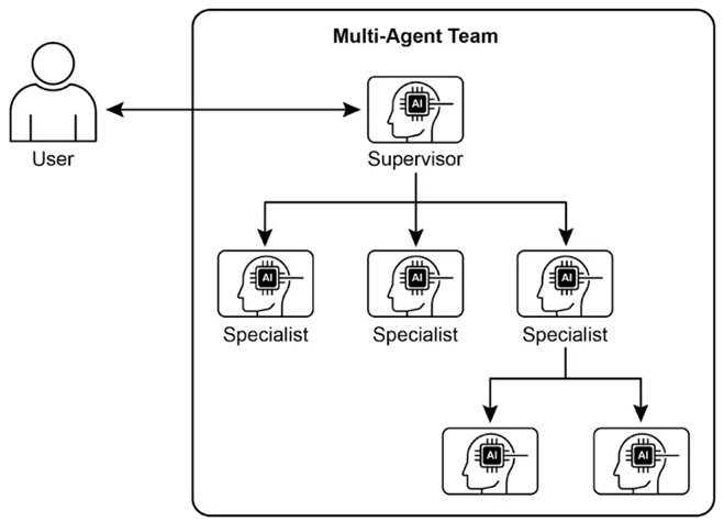 面对复杂、多领域任务时,单一智能体能力往往受限,多智能体协作模式通过将系统结构化为多个独立且专用的智能体协作团队,解决了这一局限。该模式基于任务分解原则,将高层目标拆分为若干子问题,并分配给具备相应工具、数据访问或推理能力的智能体。适用于需多领域专长或多阶段复杂问题。