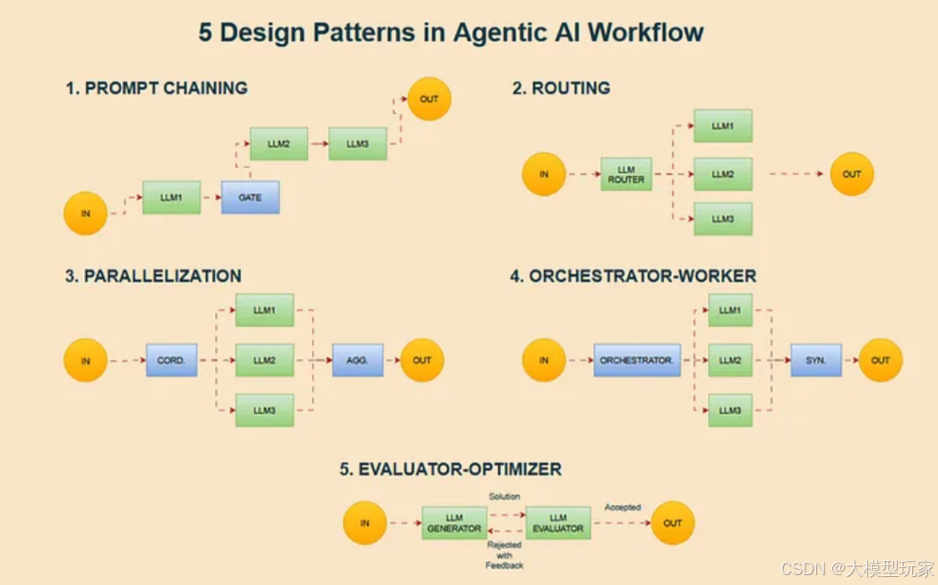 以下是确保智能体工作流畅运行的五大核心模式,每种模式都代表编排LLM调用与工具使用的典型方法。下文将逐一深入解析这些模式。