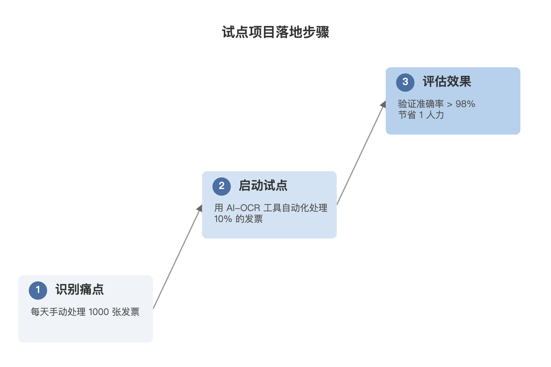 在你的公司里,找一个最疼、最具体、最重复的痛点。比如,就是前面说的“财务部手动录发票”。这个场景足够小,价值足够明确。然后,去找市面上成熟的 AI-OCR 工具,搞个“试点项目”。就先拿 10% 的发票给它处理,看看识别率怎么样,跟现有流程嵌不嵌得进去。花小钱,试个错。如果效果好,再逐步推广;如果不行,赶紧掉头,损失也不大。