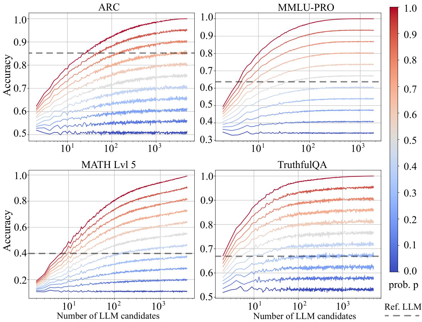 接着他们在 ARC、MMMU-PRO、MATH Lvl 5、TruthfulQA 上,针对不同候选规模 m m m,反复从大池子里均匀采样 m m m 个候选、重复 100 次取平均表现,得到 Fig.2 的趋势:当 router 更强时,随着候选数增加性能会更快提升;论文特别指出在 p ≥ 0.5 p \ge 0.5 p≥0.5 时提升更明显。