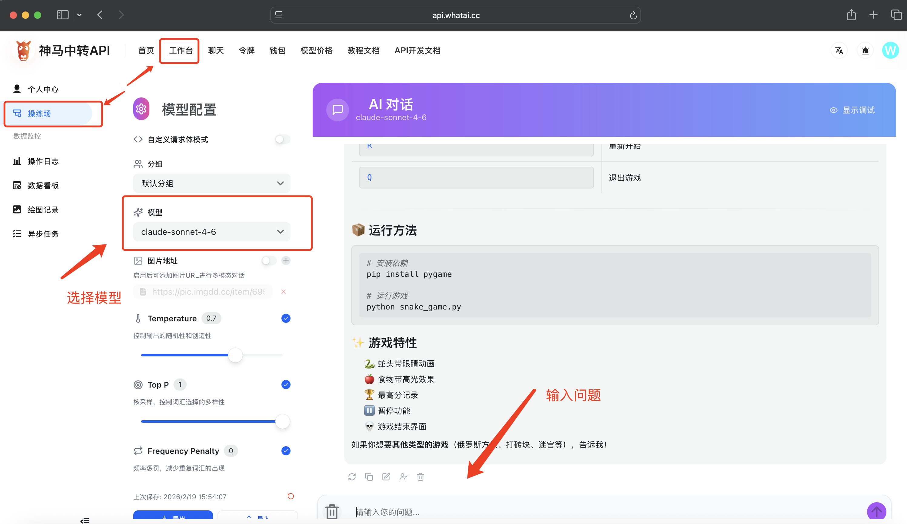 首页-工作台-操练场选择模型claude-sonnet-4-6,输入问题测试使用