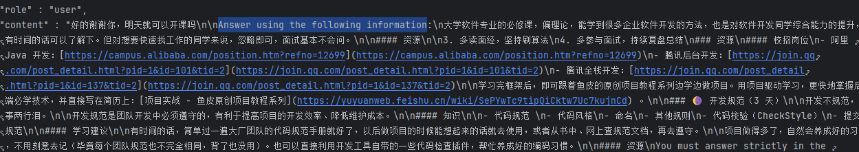 我们可以看到我们的usermessage后面跟着Answer using the following information,后面就是我们的RAG比对后得来的拼接的prompt了: