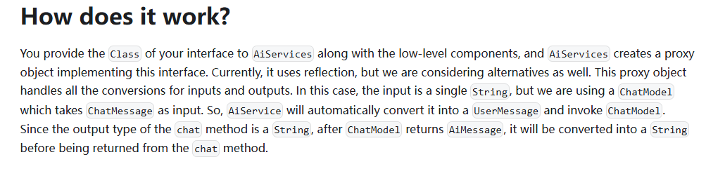 从官方文档可以看出,只要创建了这个动态代理,接口里面你定义的方法就只需要输入String类型的数据,它会将其自动封装为ChatMessage传入,返回的也会是个String,但是你还可以通过指定返回类型来控制其格式(后文说)