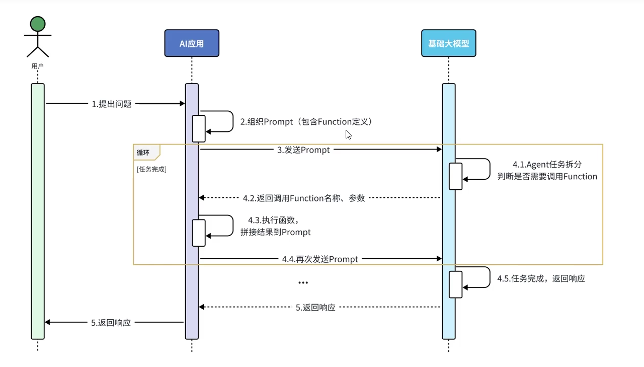 这样LLM就能知道它能调用我们提供的这些工具(函数),如果它需要调用,就会暂时不返回最终结果,而是说明需要调用什么函数,函数调用完再拼接prompt发送给LLM,LLM再生成最终的结果(当然如果还需要调用function那就一直循环)