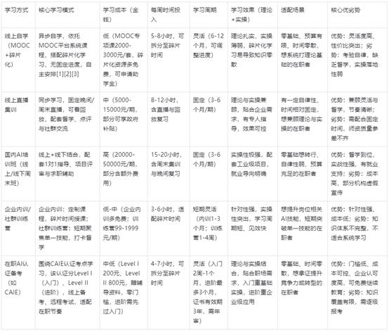 核心适配逻辑:零基础、预算有限、时间零散→线上自学+CAIE备考;时间中等、想兼顾理论实操→线上直播集训;想快速转行、预算充足→国内AI培训班;想岗位适配、短期突破→企业内训+社群训练营。