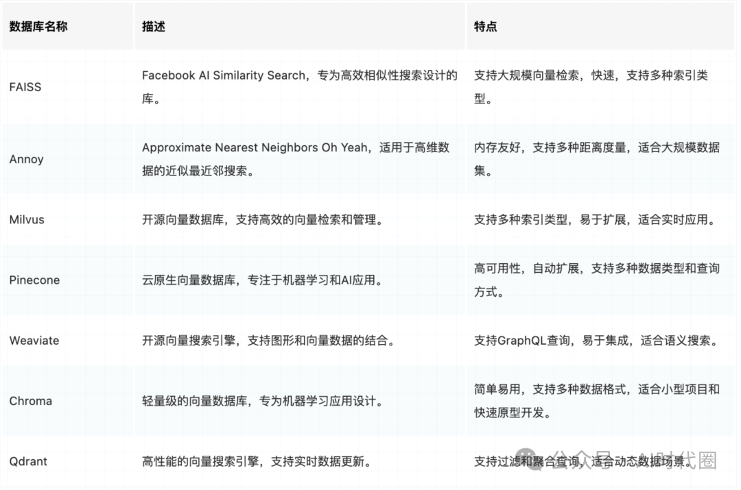 向量数据库(Vector Store)是常见的存储向量的方式,LangChain支持多种向量数据库,包括开源和商业产品,如Elasticsearch、Faiss、Chroma和Qdrant等。向量数据库各有特点,适用于不同的应用场景。选择合适的数据库可以提高向量检索的效率和效果。下面列举一下目前市面上常用的向量数据库的类型及其特点: