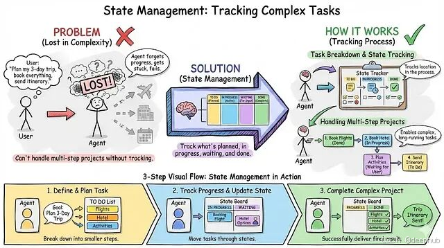 状态管理就是跟踪每个任务处于什么阶段——已规划、进行中、等待输入、已完成。没有这层机制,稍微复杂点的需求Agent就搞不定。