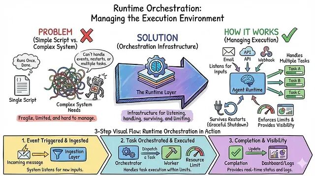 运行时编排就是这套基础设施。Agent怎么监听多个输入源?怎么优雅关闭?怎么让外部看到它在干什么?怎么防止某个任务把资源全吃光?这些都是编排层要解决的问题。