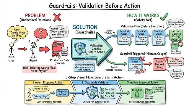 护栏就是在操作真正执行前跑的一道验证。检查权限、校验参数合理性、扫描输出里有没有敏感信息。本质上是一层安全网,在错误造成实际损害之前把它拦下来。