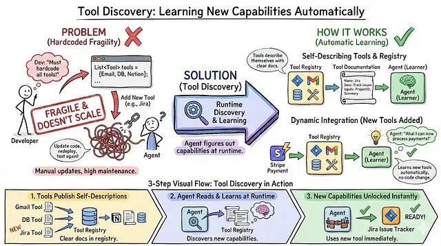 工具发现的思路完全不同:工具自带描述文档,Agent在运行时读取这些描述,自动学会怎么调用。