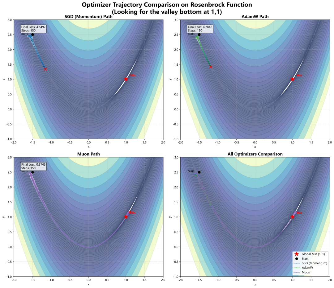 为了直观展示两者的区别,我们在经典的 Rosenbrock 函数(香蕉函数)上模拟了 SGD、AdamW 和 Muon 的寻优路径。