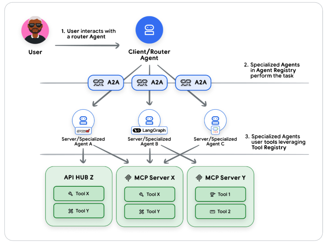 现在你已经构建了数十个Agent,但问题在于:这些Agent无法相互沟通,无论是因为他们是在不同的框架、项目中创建的,还是完全在不同的云平台上创建的。