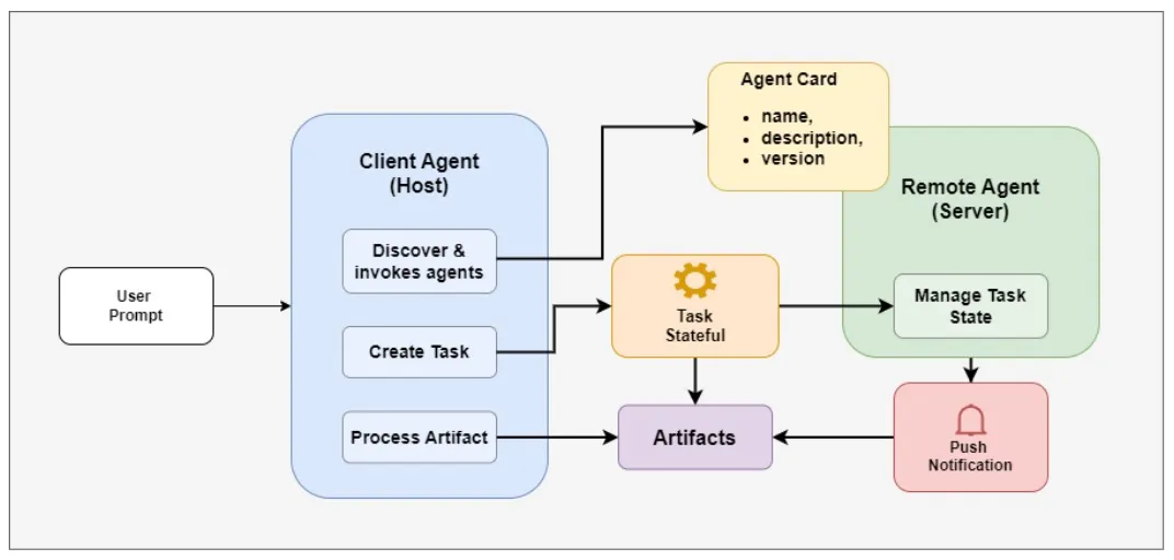 A2A(Agent2Agent Protocol)由 Google 在 2025 年 4 月提出,专注于 AI Agent 之间能够进行通信、协作和任务委托,并以结构化格式返回结果。支持异步工作流和多模态交互。通过 A2A 协议,Agents 之间可以了解彼此的技能,并完成任务的委托。