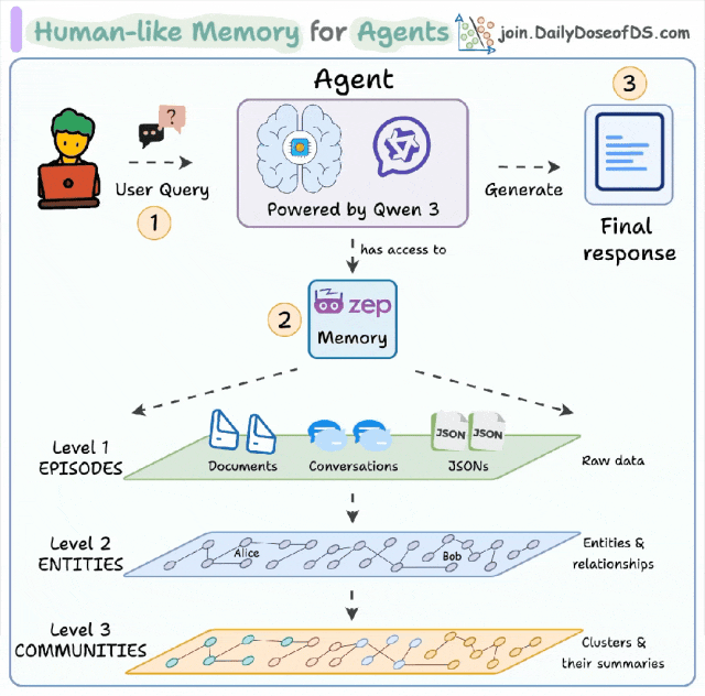 这种架构设计使得 Zep 系统既能保留细节信息,又能进行抽象推理。