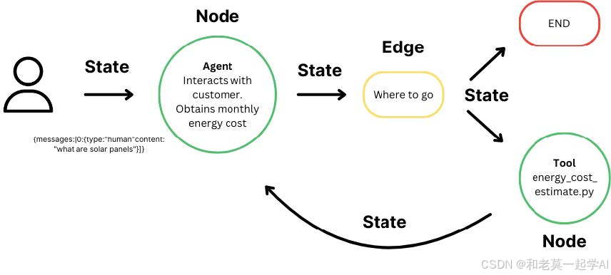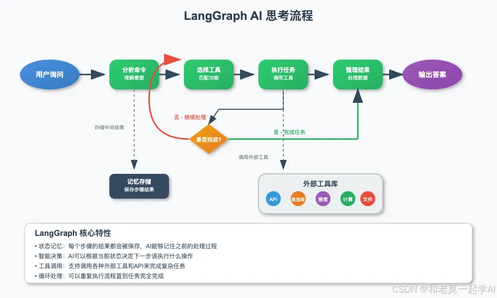 值得注意的是 LangGraph 中的 State 机制。常规的 LLM 模型 API 调用不能维持多步骤的连续推理过程,每次对话都是独立的,不能记住之前的处理结果,也不能基于中间结果动态调整后续步骤。LangGraph State 正是为了解决这个问题,它将复杂任务分解成多个步骤,并记住每个步骤的结果。后续步骤可以访问前面步骤的结果和数据,并根据结果判断调整执行路径,最终完成整个任务链条。