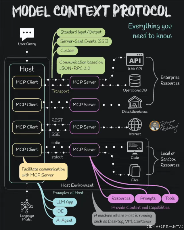 - MCP Host:LLM 应用及其运行环境,例如:ChatBot、AI IDE、AI Agent 等。