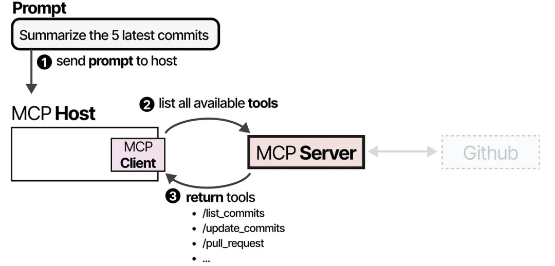 - 使用 LLM 应用总结代码库中最近的 5 次提交。MCP Host with Client 首先调用 MCP Server,询问有哪些可用的 Tools List。