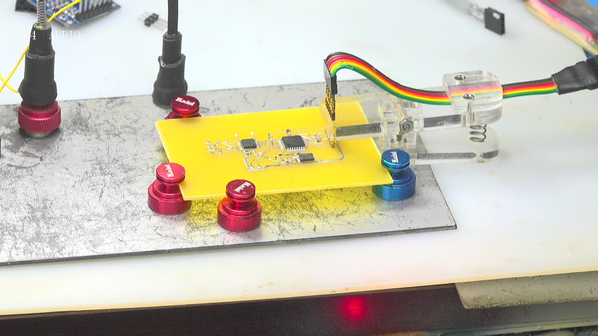 电路板制作的非常完美, 焊接清洗准备后面的测试。 焊接电路板的时候, 特意将原来晶体联的两个 20pF的电容空开, 没有焊接, 测试是否单片机仍然能够正常工作。 如果是这样,将来在设计制作测试电路的时候, 可以简化电路的设计和焊接。 经过测试可以发现, M8 能够正常的工作, 外部晶体震荡正常。 这说明将来的确可以省略时钟晶体并联的20pF电容。