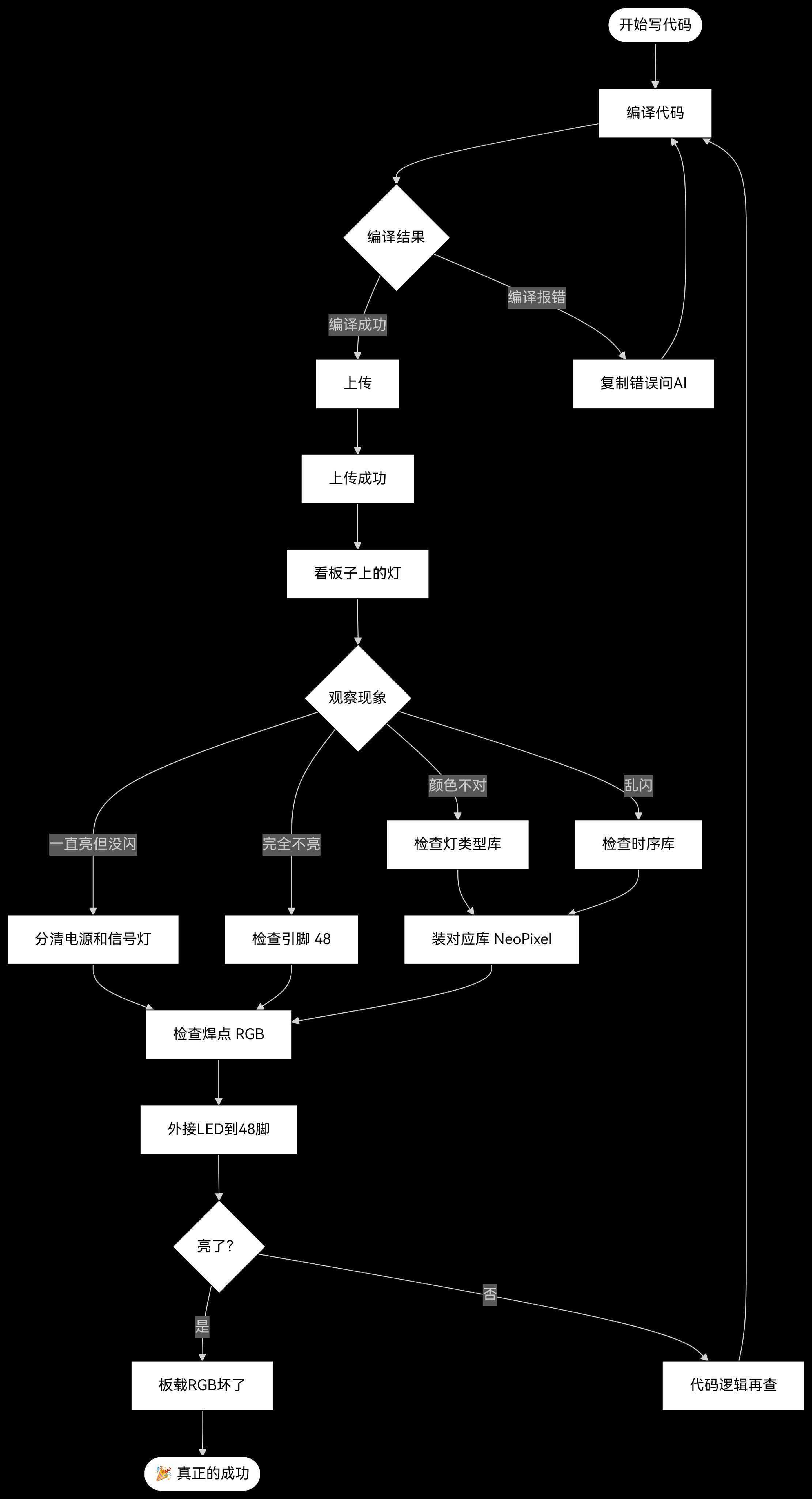 以后任何人灯不亮,你都可以说:“先分清哪个是电源灯哪个是可编程灯,再检查引脚对不对,确认灯的类型,看库装没装,最后看看板子上有没有焊点要连——这些都是我拿第二个下午换来的血泪经验!对了,终端颜色会说话,黄色别急,红色别慌,把报错甩给AI就行。” 😎