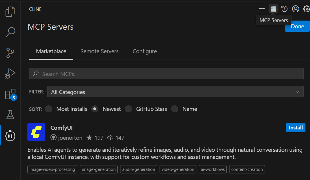 配置完成后可以按照需求直接在cline内安装MCP server,类似应用商店