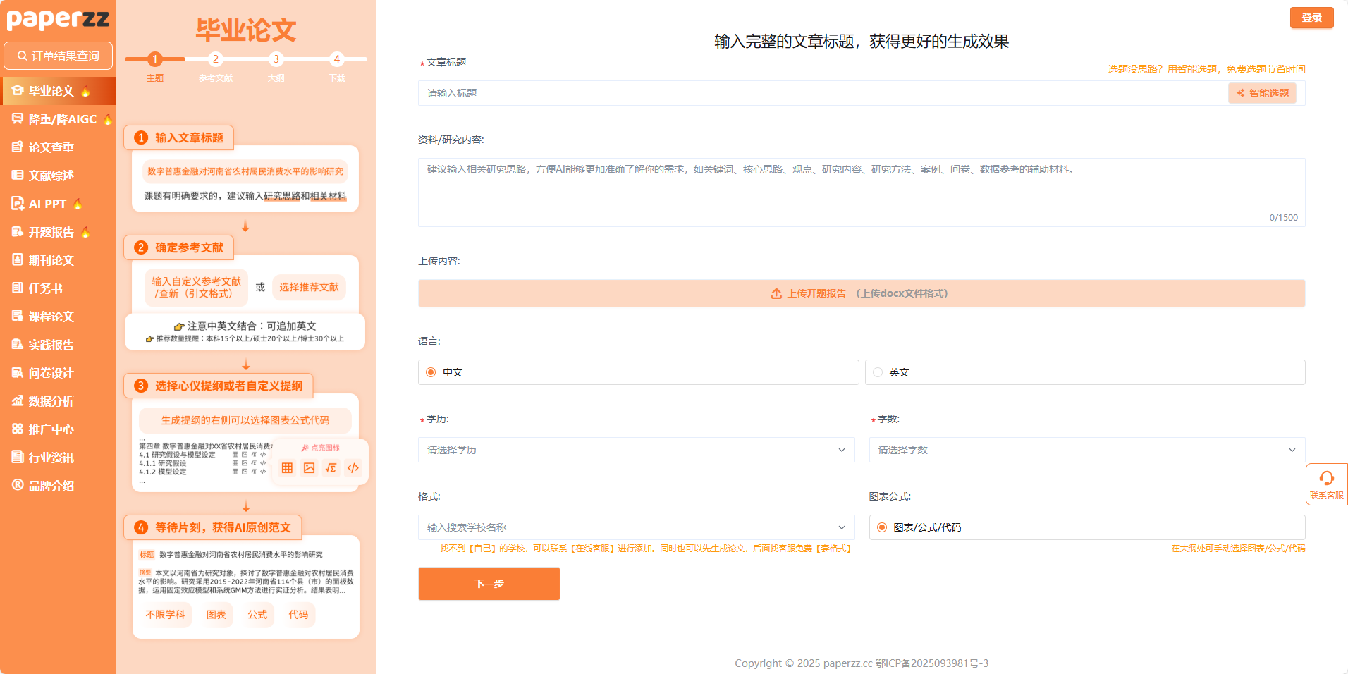 现在,打开 PaperZZ,输入你的论文标题,开启这场属于技术人的写作革命吧。愿你既能高效搞定论文,也能从容享受毕业季的美好,为你的学生时代画上一个圆满的句号。