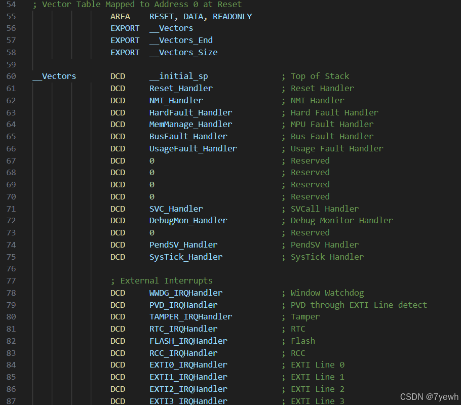 The following three EXPORT directives make __Vectors, __Vectors_End, and __Vectors_Size global symbols, so that other files (such as CMSIS code) can reference them to obtain the location and size of the vector table.