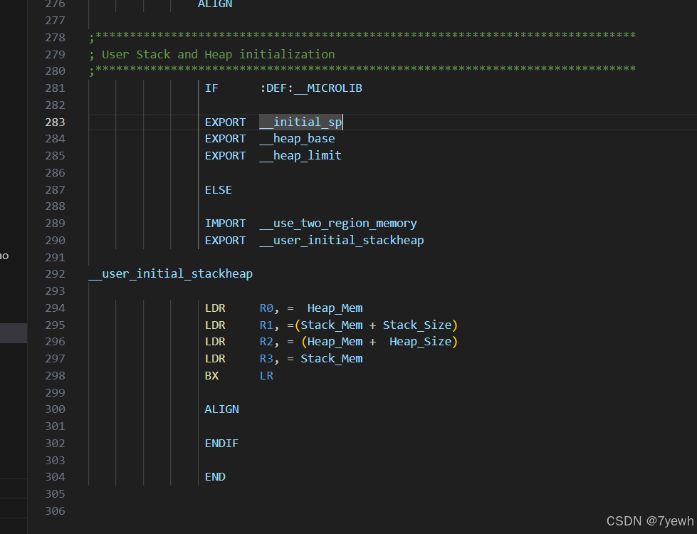 The final part handles stack and heap initialization. If __MICROLIB is defined, indicating the use of Keil’s MicroLib, only the symbols __initial_sp, __heap_base, and __heap_limit are exported, and the library uses them directly. If the standard C library is used instead, __use_two_region_memory is imported to select the two-region memory model, where stack and heap are placed in separate regions. In that case, the function __user_initial_stackheap is implemented to return the heap start, stack top, heap end, and stack bottom through registers R0 to R3 according to the ARM calling convention. The END directive marks the end of the assembly file.